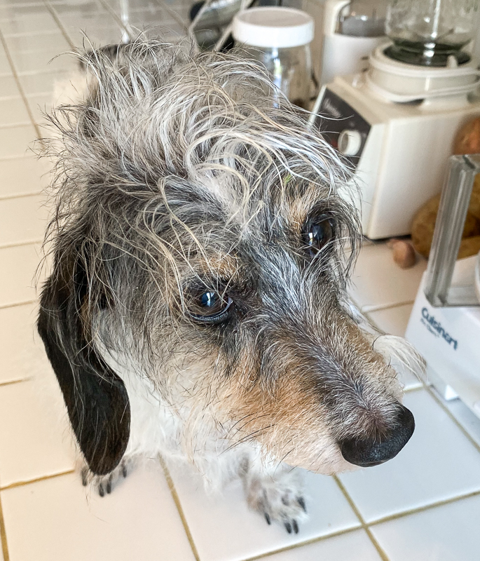 She’s twelve, is Queen Daisy. And not happy with the picture taking. Or the cutting of the hairs. After her haircut I’ll have to lug her majesty to the vet for a mani/pedi.