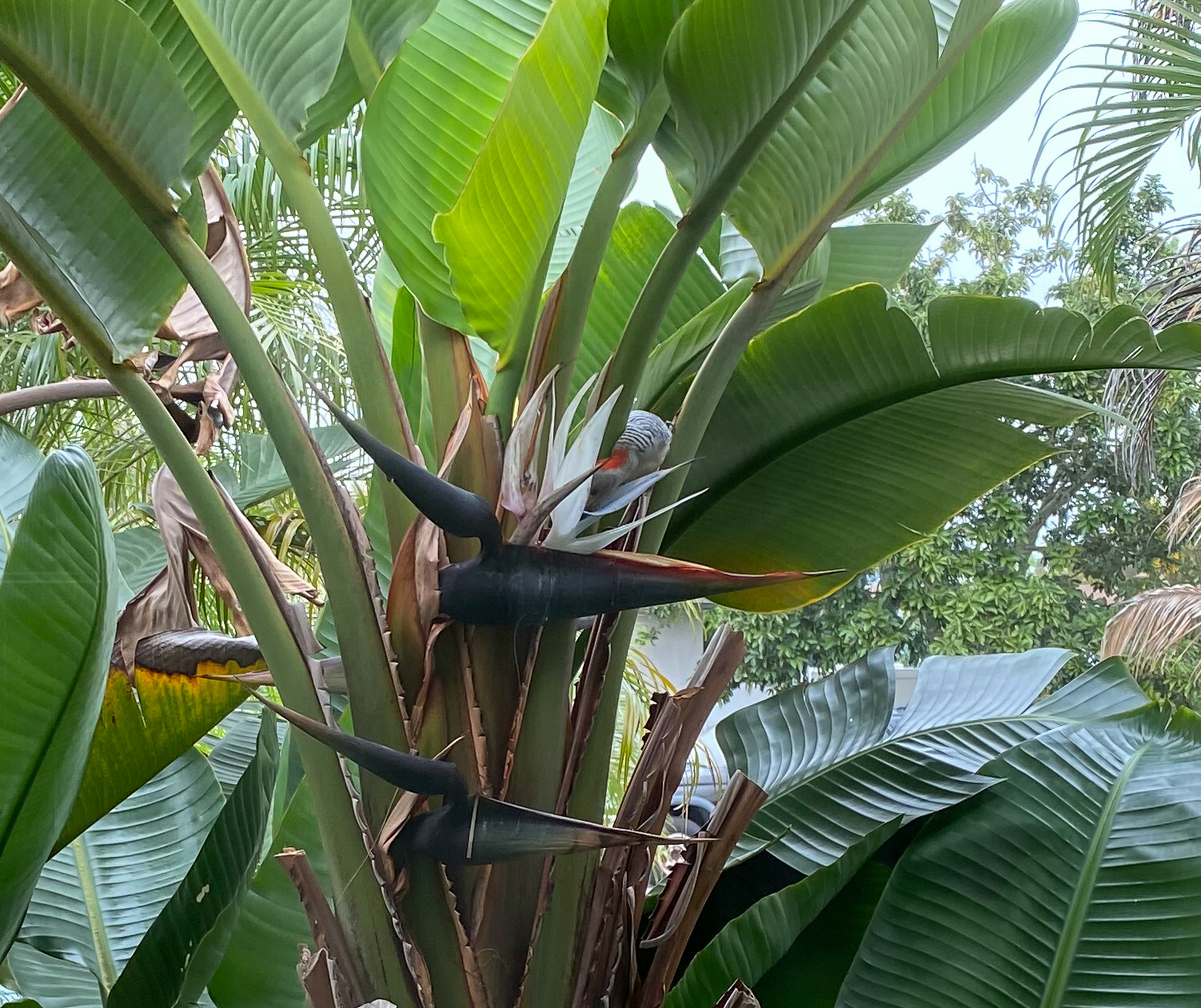 Bad photo because it’s so zoomed in… but look at this precious woodpecker drinking from the Bird of Paradise bloom…