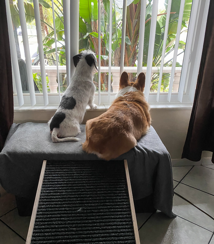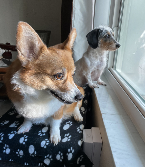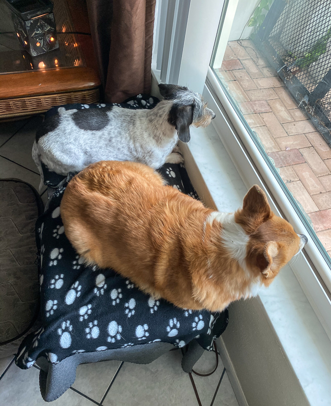 Can’t deny I think my dogs are cuteness taken to the nth degree. Here, they’re watching a vehicle pulled up outside -the person inside obviously making room for someone to get into the passenger seat. They were absorbed by his every move but never made a sound after he first pulled up.