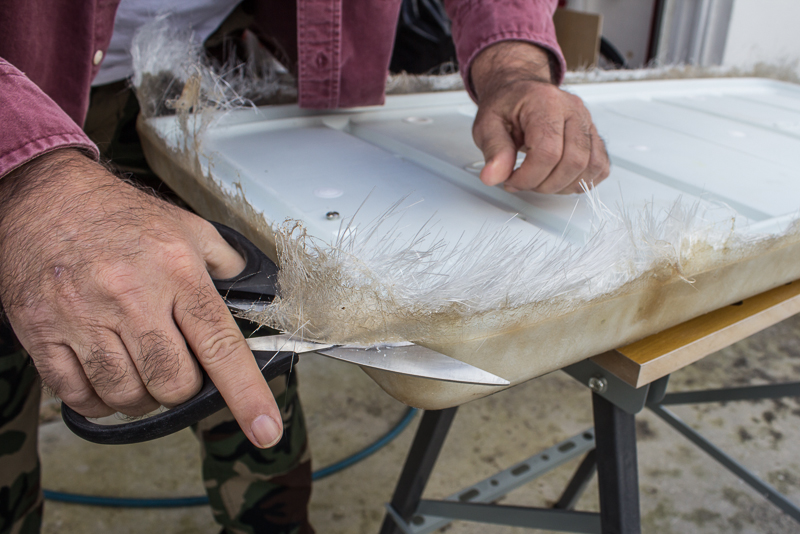 The man is working on something. A cooler; I don’t know. He’s doing something with fiberglass.