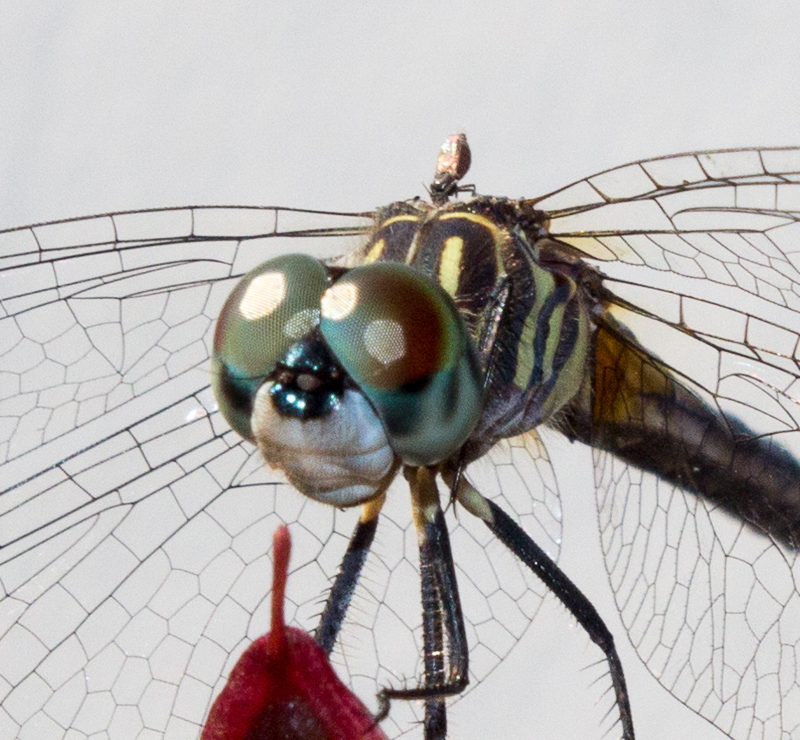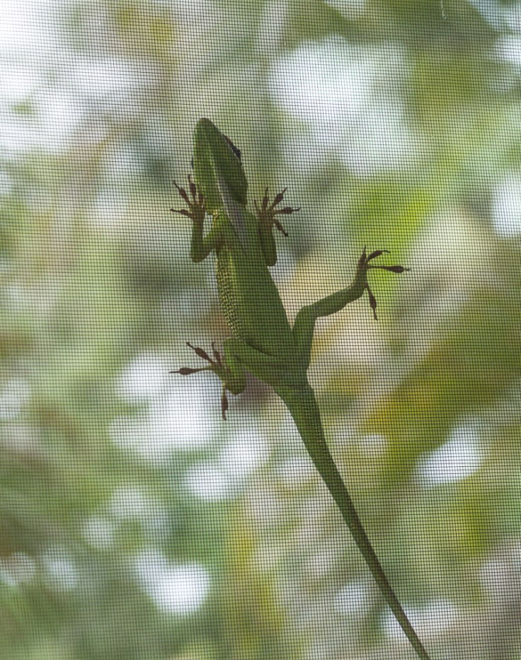 A neighborhood cat ran it up to our front porch, Arthur chased the predator off and now this goober is clinging to our screens like a frightened mouse.